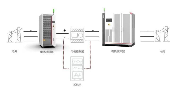 针对电控下线测试,电机模拟器一体机具备两路输出通道,直流输出支持磷酸铁锂、三元锂等动力电池模拟功能,交流输出支持电机模拟及故障注入等功能,替代电驱台架系统中的电机及其机械负载,以满足不同规格驱动电机控制器的快速下线。